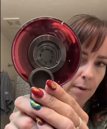 Luego, retira con cuidado la tapa ubicada en el centro del cabezal del masajeador. Aplica uno de tus sérums capilares cremosos favoritos.